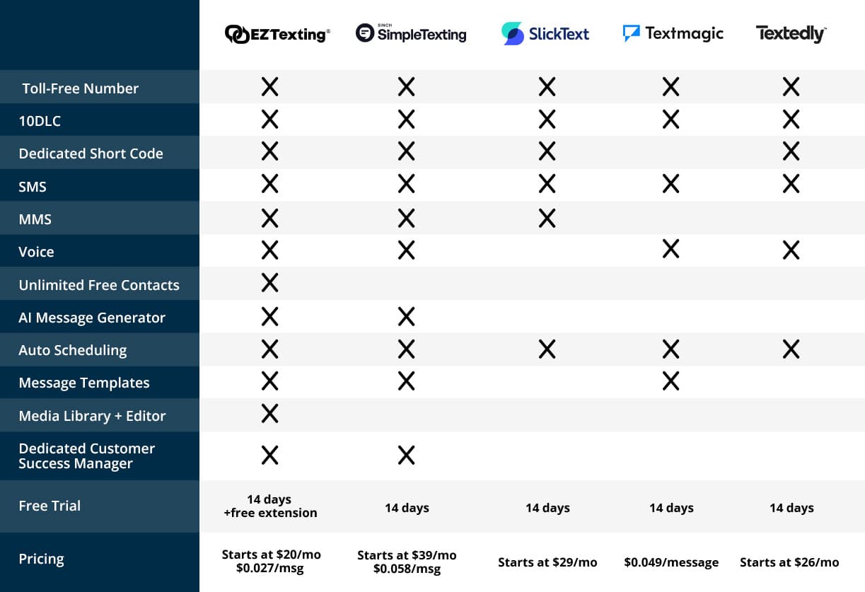 Its 15 years of experience in the text marketing industry and white-glove setup, onboarding, and continuous support ensure a seamless experience for over 230,000 satisfied customers. While SimpleTexting, Textedly, SlickText, and TextMagicoffer valuable tools for targeted marketing and analytics, none match the scalability, trusted carrier relationships, and powerful integrations that EZ Texting provides, making it the top choice for businesses looking to enhance customer engagement and drive results effectively.