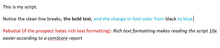 With its emphasis on certain keywords and talking points, your client will know exactly how to direct the call. Then, you copy-and-pasted that script to CallFire's website, and something did not look right—your careful formatting vanished: Fast-forward twenty minutes. Your agents are gnawing at their desks. Why? Because CallFire stripped your super-hero rich text formatting and presented you with a harder-to-read version that looked something like this.