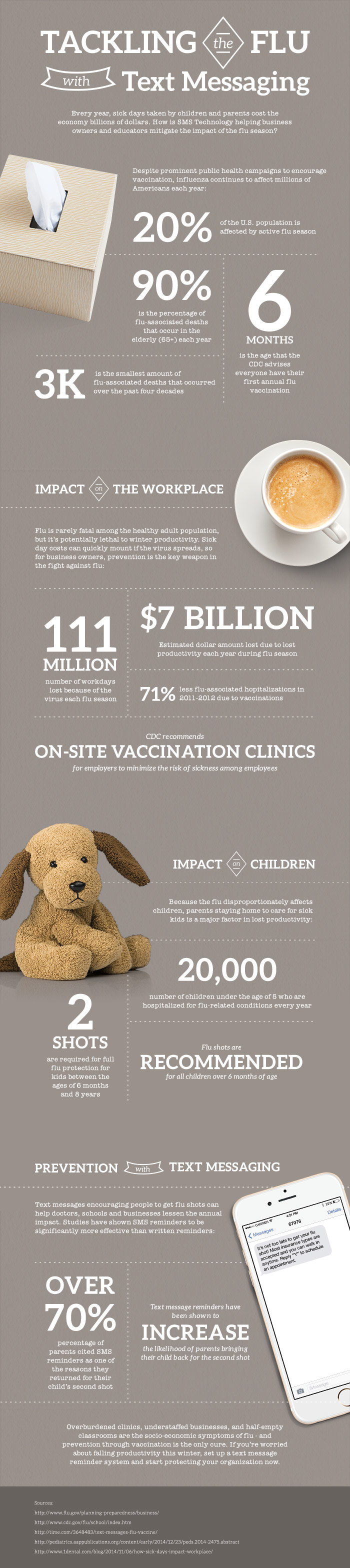 The flu virus costs the economy billions each year - but it doesn't have to be this way. Increasing the number of people who get vaccinated will reduce the number of sick days for children and workers alike. This infographic highlights the scale of the problem and the role of SMS messaging in promoting flu shots.