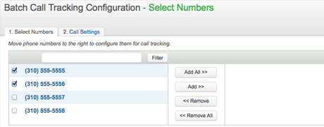 With our new Batch Call Tracking Configuration – Select Numbers screen — the Select Numbers tab — choosing the numbers for your Call Tracking campaigns is simple. Just click the appropriate Add button, and then click next!