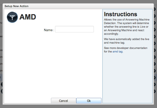 The AMD button allows the use of answering machine detection. The system will determine whether the answering line is live or an answering machine, and then proceed according to the IVR commands you have created. When you drag and drop the AMD button into an IVR, CallFire's system automatically adds one live and one answering machine tag underneath it. Live is the message that is played when a live person answers the call; Machine is the message that is played when the call reaches an answering machine.
