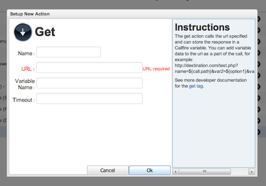 With the Get tag, you can call any URL or http request right from your IVR. This tag works with CallFire XML variables and the PHP script to obtain data from a specified source. The resulting data string can be stored under a varname and referenced later in the script.
