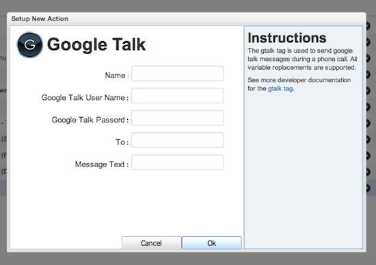If you're not familiar with it, Google Talk is an instant messaging service that allows for text and voice communication. Within a CallFire IVR, the Google Talk tag is used to send Google Talk messages during a phone call. All variable replacements are supported.