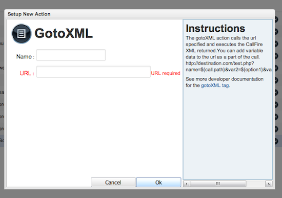 The Goto XML button jumps to a CallFire XML at a URL you specify. You can add variable data to the URL as a part of the call.