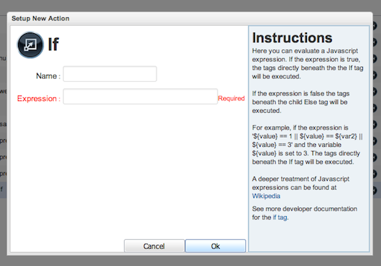 Here you can evaluate a JavaScript expression. If the expression is true, the tags directly beneath the the If tag will be executed. If the expression is false, the tags beneath the child Else tag will be executed.