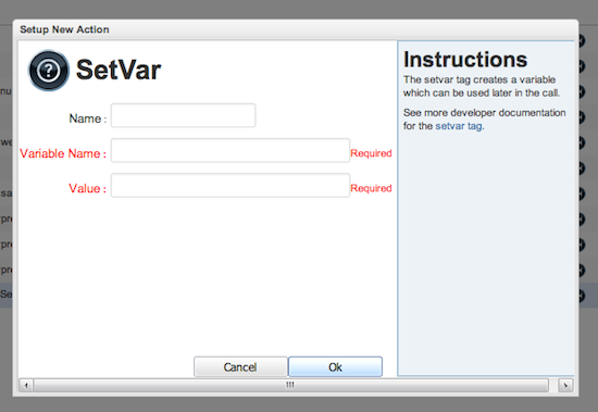 The SetVar tag creates a variable which can be used later in the call. Drag the button down into the workspace, and then double-click the icon. This brings up the Set Up New Action box, as can be seen below.