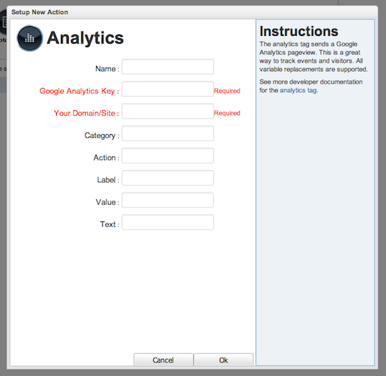 The Analytics tag sends a Google Analytics pageview. It's a great way to track events and visitors. Please remember that all variable replacements are supported.