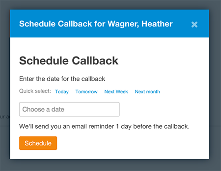 You also have the ability to Schedule Callback. Use this option to create an email reminder to call the contact back at some time in the future. The reminder will be sent to the registered agent email address, and the scheduled callback will appear on your agent home screen at log in.