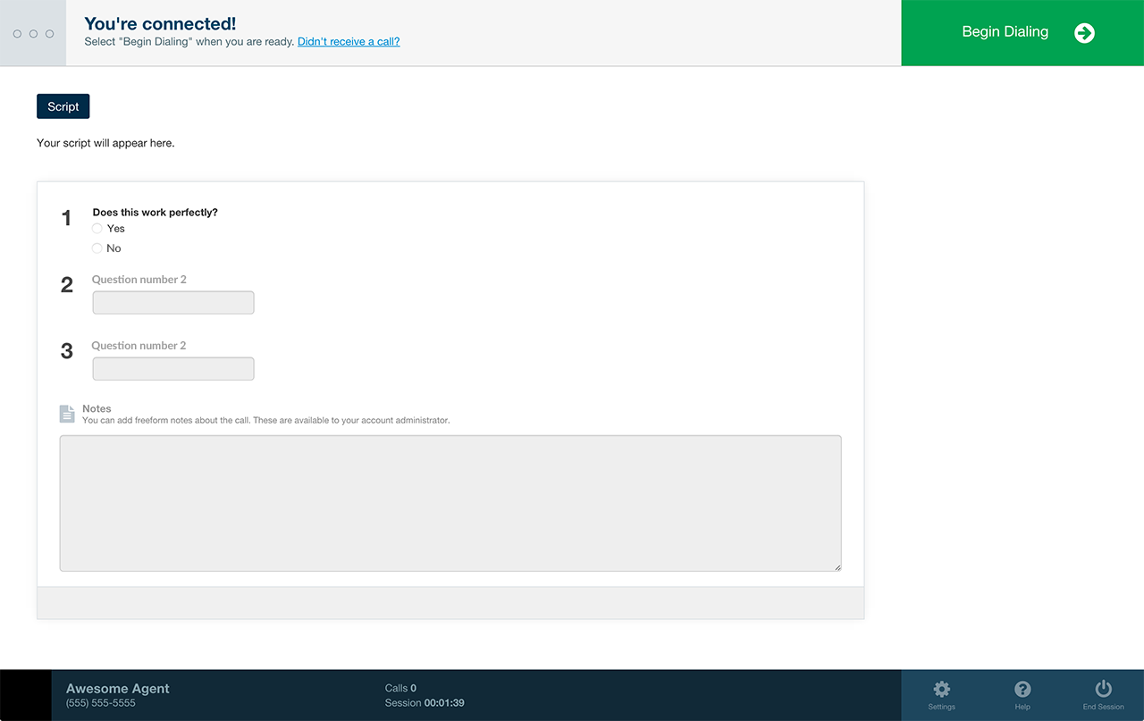 Once you've answered CallFire's agent callback, you will be taken to the dialer window. Here you can review your script and questions before making your first call. Keep in mind some elements of the interface may differ between campaigns according to the administrator's settings for that campaign.