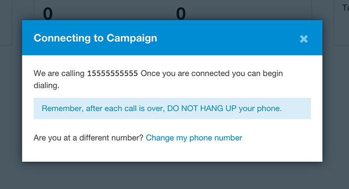 You will receive an incoming call from CallFire almost immediately. Answer the call and DO NOT HANG UP your phone. You need to maintain this connection in order to make calls.