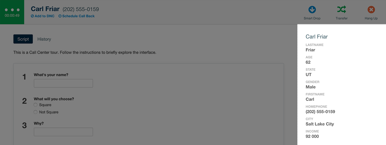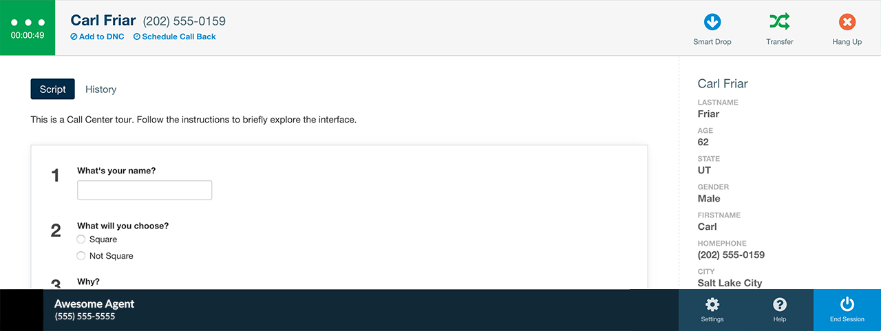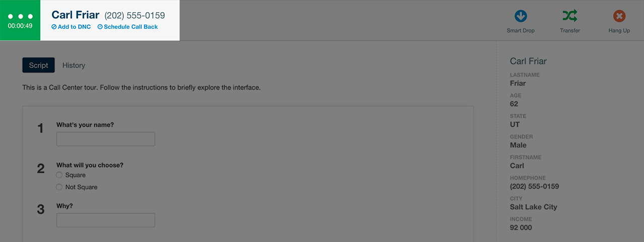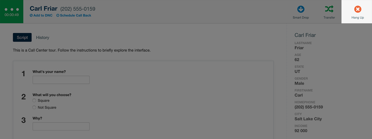 During your conversation, you can record any requested information from the call in the form provided. (The administrator may not have specified any information to collect). To end a call, DO NOT hang up your phone. Simply click "Hang Up" in the upper right corner of the dialer window.