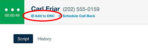 Under the contact name, you will always see an option for Add to DNC (Do Not Call). If you add a number to your DNC list, it will be saved in your CallFire account and regularly reported back to Allstate.