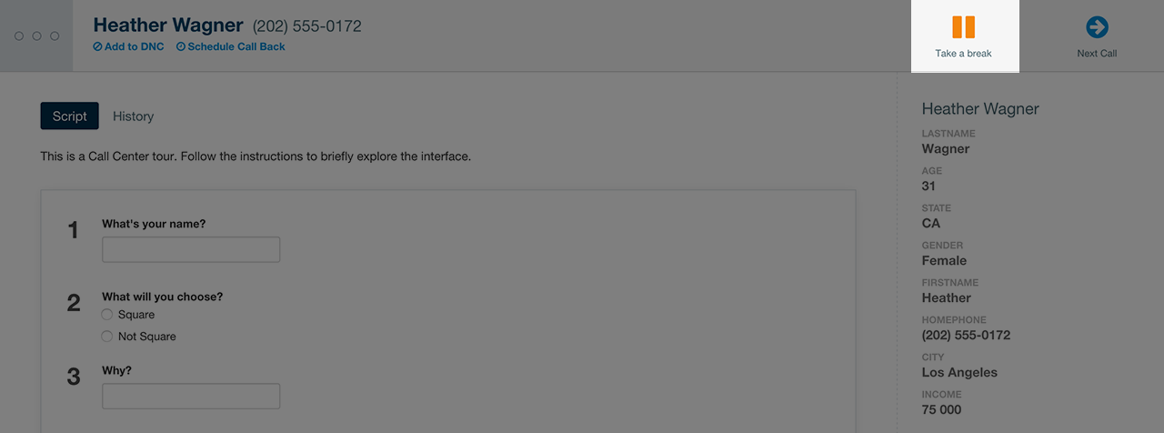 If you need to pause briefly between contacts, you can use the Take a Break button. You might choose this option if someone stops by your desk to ask you a quick question, or for a quick trip to the coffee pot to refill your cup. Once you return, you will click the Resume button to continue dialing.