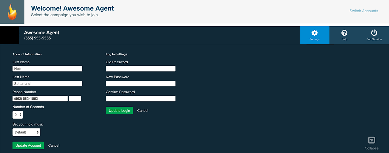 Notice the settings bar at the bottom of your screen. Click the "Settings" icon. Here you can edit your agent account details and phone number, or change your hold music, even during a dialing session.