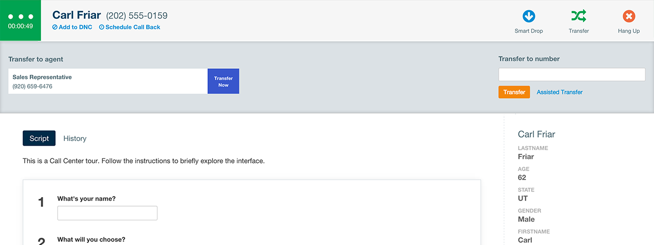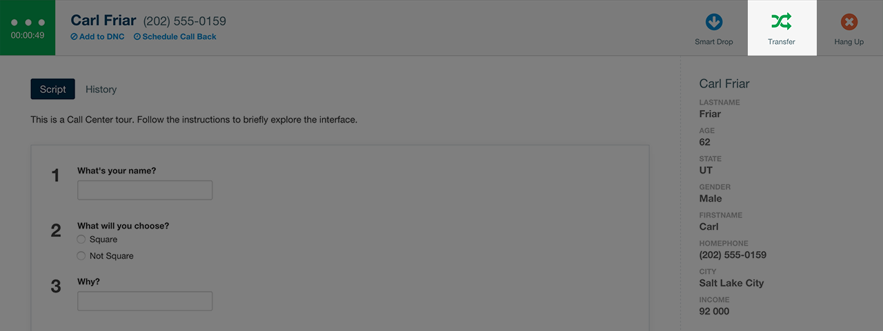 If the account owner has enabled transfers, you will see one or more options to transfer your contact to another number. You might use this to transfer an interested prospect to a licensed sales producer.