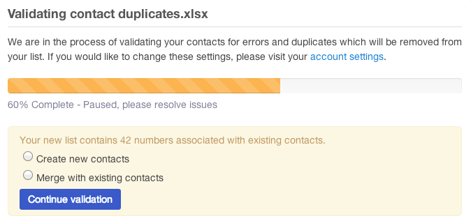 This validation runs the list against your Do Not Contact list to see if any of the numbers being uploaded are on your account's Do-Not-Contact numbers. Depending on the type of campaign, CallFire will either scrub against the Do Not Call or Do Not Text list. More about how Do Not Contact works at CallFire is available here.