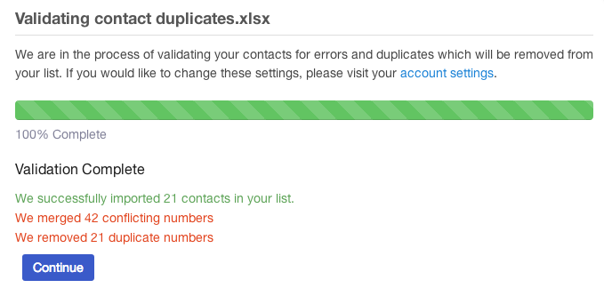 Below you can see that 42 contacts were "merged" into our existing database (so we don't now have two records for John Smith and Mary Jones), and 21 contacts were removed from the campaign (so we don't call Jerry Porter twice in this campaign).