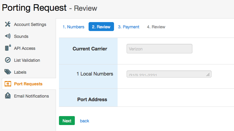 Review the information you just entered on the next screen — Porting Request - Review (seen below). If you need to make any changes, click on the blue Previous button and make any necessary changes. Otherwise, if everything looks okay, click on the green Next button.
