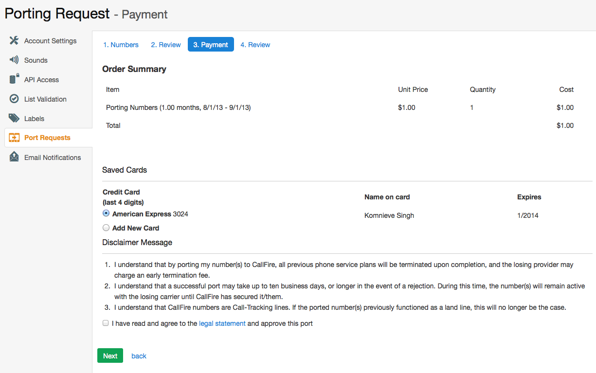 On the next screen, the Porting Request - Payment page, you'll see the charges for the porting of the number(s). You'll see the charge for the first month of the porting of your phone number, which you don't actually incur until your number is completely switched and service with CallFire begins. Enter in your appropriate credit card information, and then read the Disclaimer Message section (seen below). Click on the checkbox stating that you have read and agree to the legal statement, and click the green Next button.